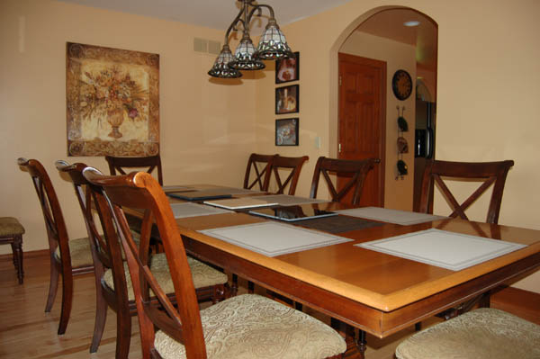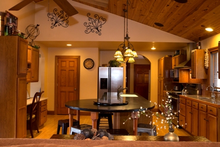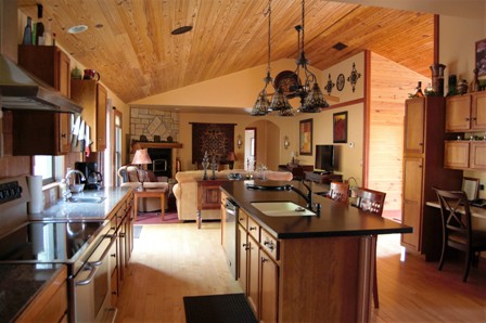 adjoins the living room under a rustic cathedral ceiling, a large dining